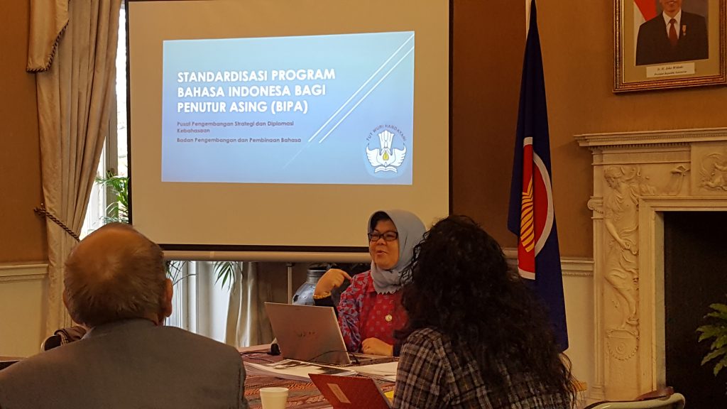 Narasumber pelatihan Kepala Pusat Pengembangan Strategi dan Diplomasi Kebahasaan (PPSDK), Kementerian Pendidikan dan Kebudayaan, Prof Emi Emilia berlangsung di KBRI London selama dua hari pada akhir pekan.